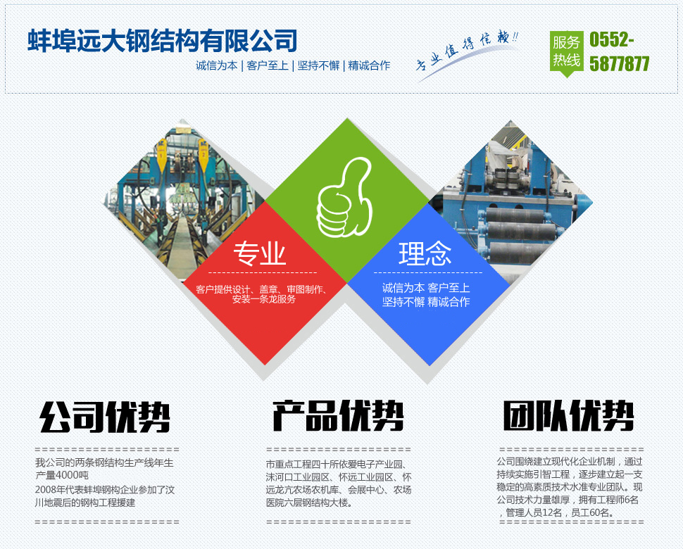 蚌埠遠大鋼結構有限公司注冊成立于2008年,公司位于淮上區拉絲橋北往東五公里力源產業園內交通便利。我公司的2條鋼結構生產線始終處較先地位,年生產量4000噸。占地1.4萬平方米,主要產品為H型鋼、Z型鋼、C型鋼、異型鋼、大型圓管、鋼結構橋梁、桁架、管架、廣告牌、鋼構件、防火夾芯板、彩鋼瓦、彩涂卷、樓承板、中板、長期代理馬鋼、萊鋼、濟鋼、寶鋼等各種鋼材。公司成立以來建設鋼結構上百起,2008年代表蚌埠鋼構企業參加了汶川地震后的鋼構工程援建,現公司參與了國家重點工程定遠華塑集團、省重點工程嘉年華游樂園、蚌埠義烏商貿城。市重點工程四十所依愛電子產業園、沫河口工業園區、懷遠工業園區、懷遠龍亢農場農機庫、會展中心、農場醫院六層鋼結構大樓。銅陵工業園區,鳳陽工業園區內大型鋼結構建設。為安徽省鋼結構事業做出了優質貢獻。   人才興企,鑄就品牌。自成立以來,公司圍繞建立現代化企業機制,通過持續實施引...